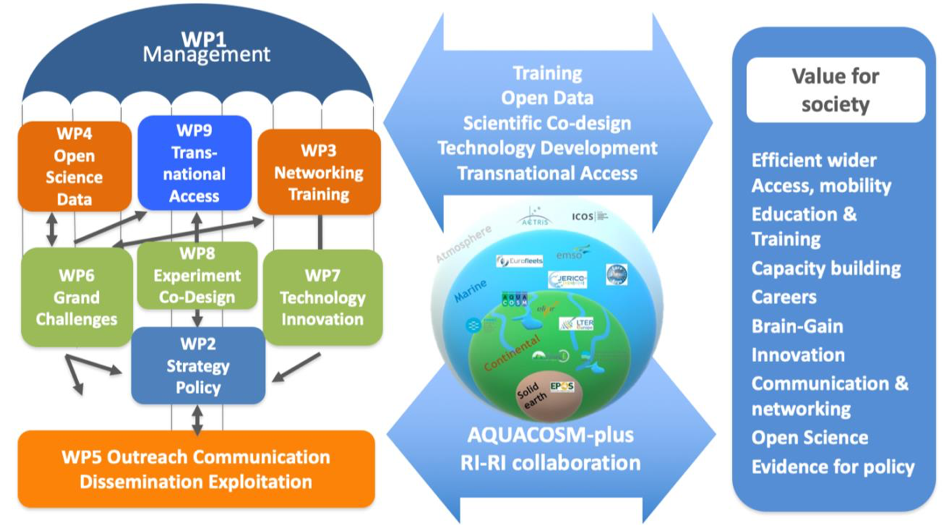 Graphical demonstration of work packages including "WP3", relations between the AQUACOSM-plus WPs, related RIs, and expected output on the left side