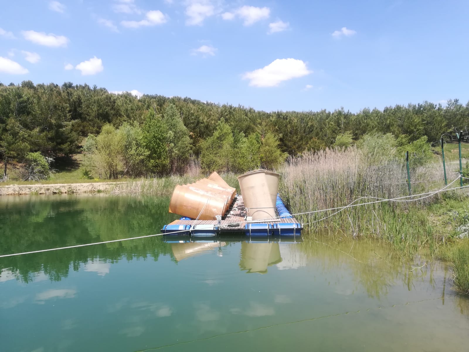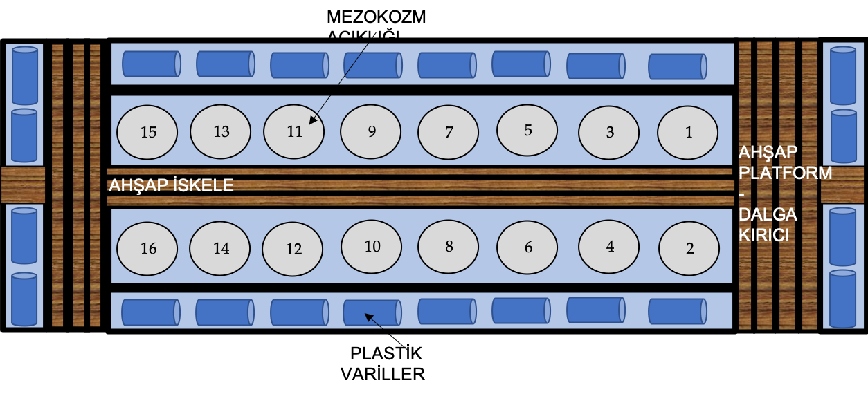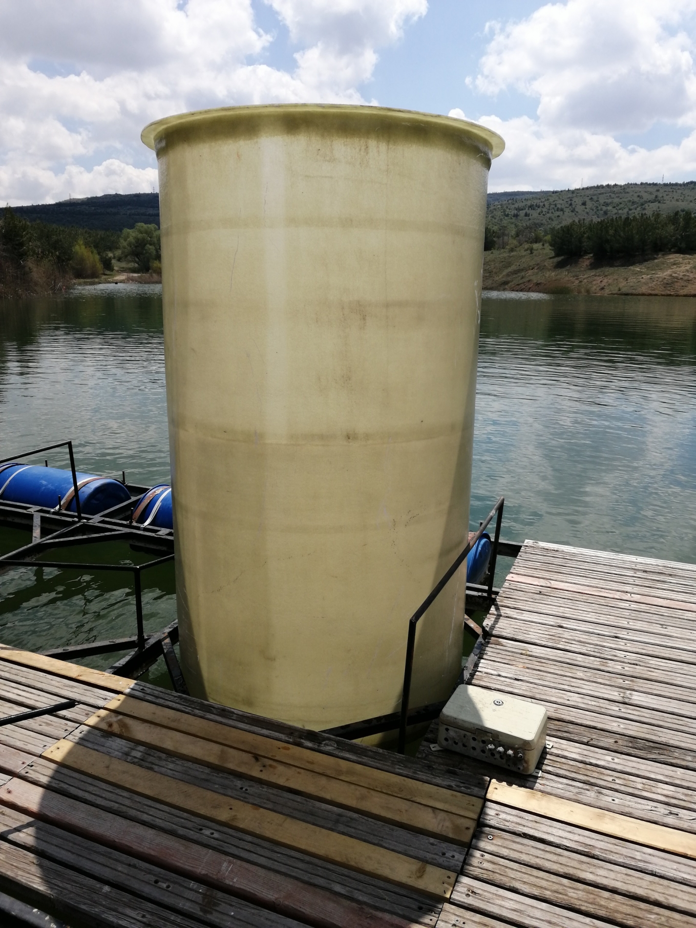 - Mezokozm tanklarımız (yarı çapı = 1,2 m), fiberglass (kalınlığı: 4 mm), iki farklı yükseklikte : 16 adet 1,2 m ve 16 adet 2,2 m olmak üzere toplamda 32 adet bulunmaktadır.